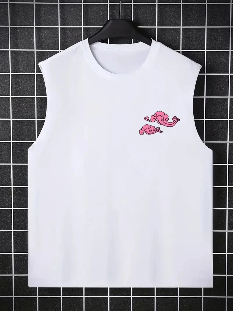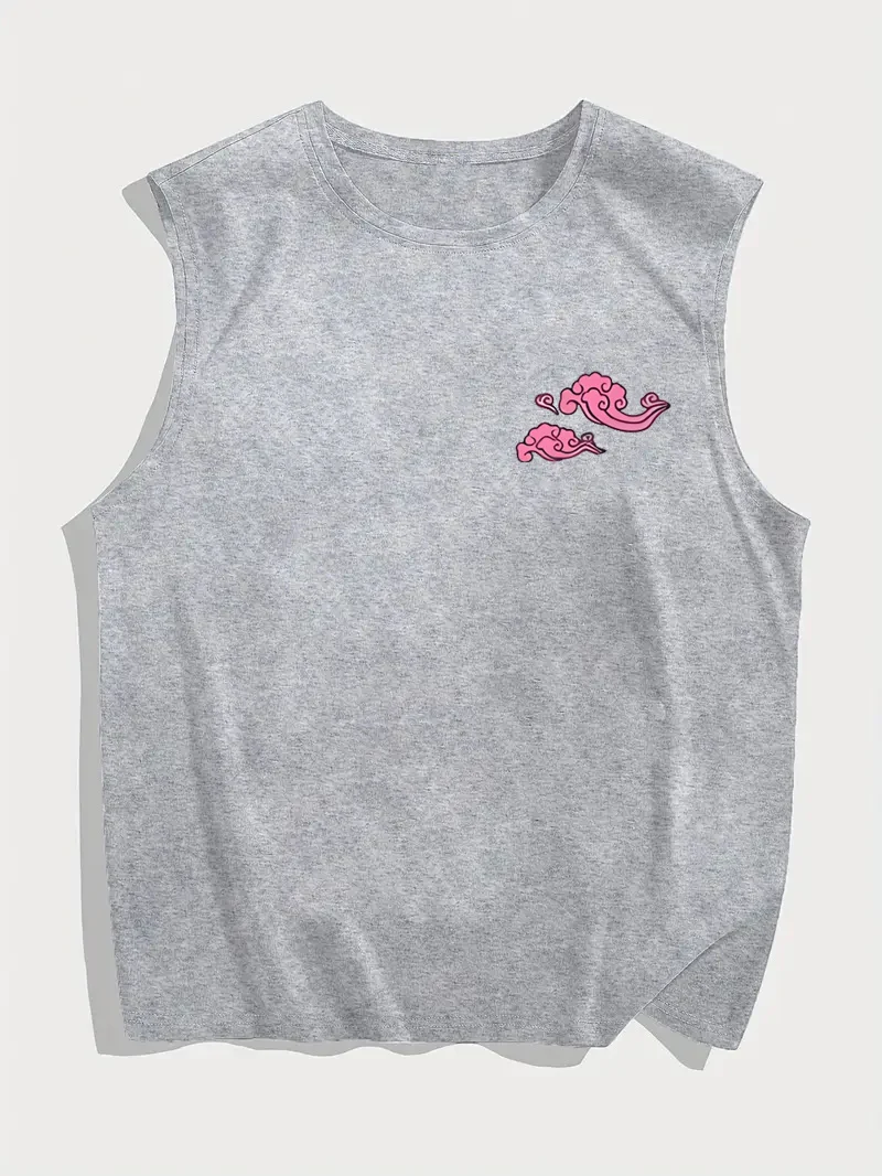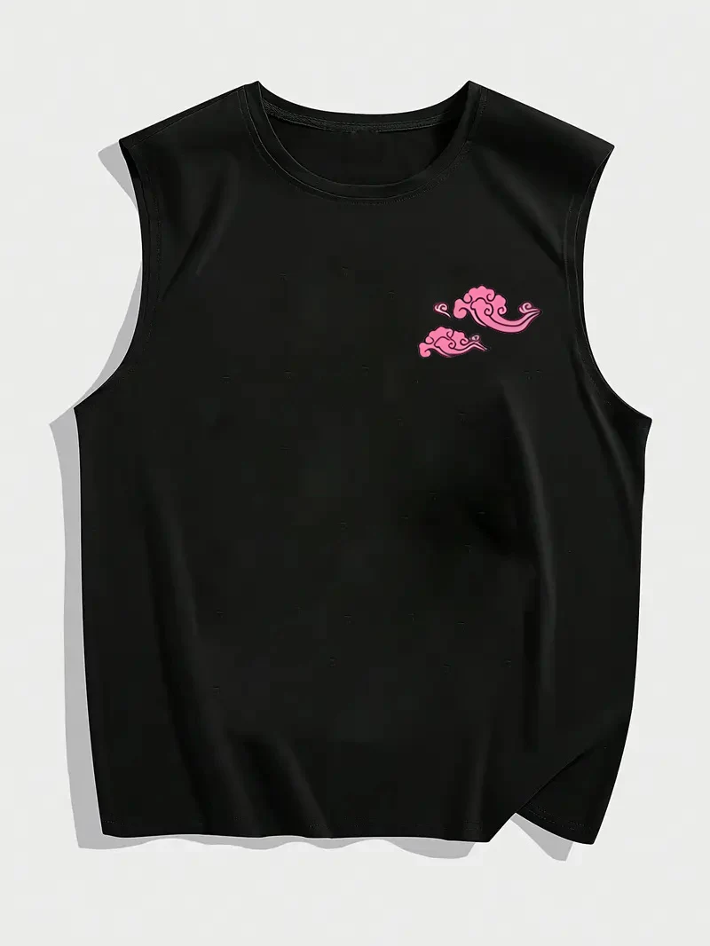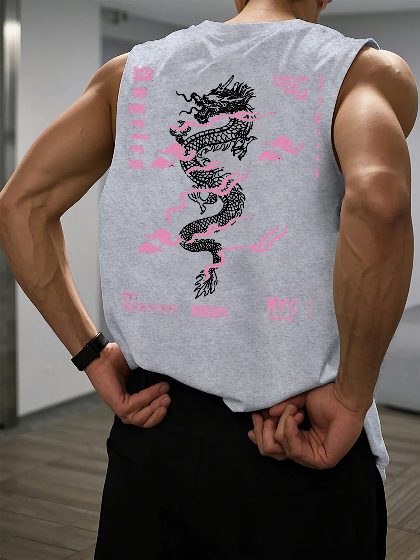 Men's Summer Leisure Sports Fitness Wide Dragon and Letter Pattern Printed Comfortable Breathable Round Neck Sleeveless Tank Top